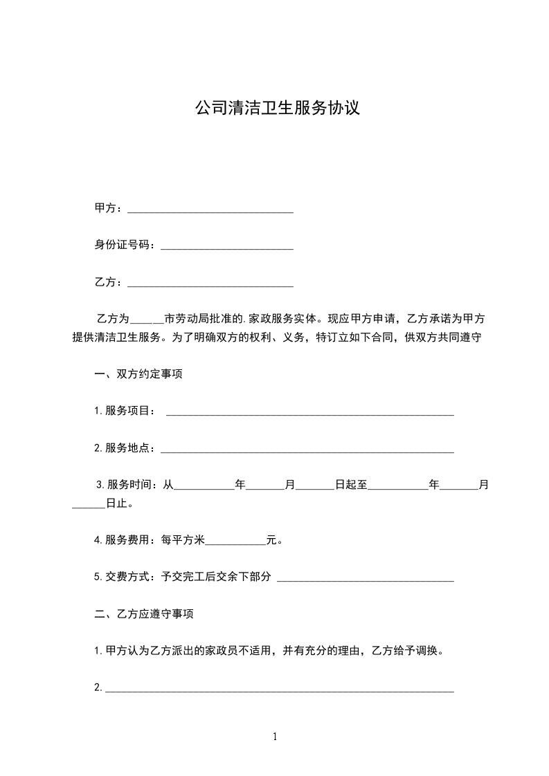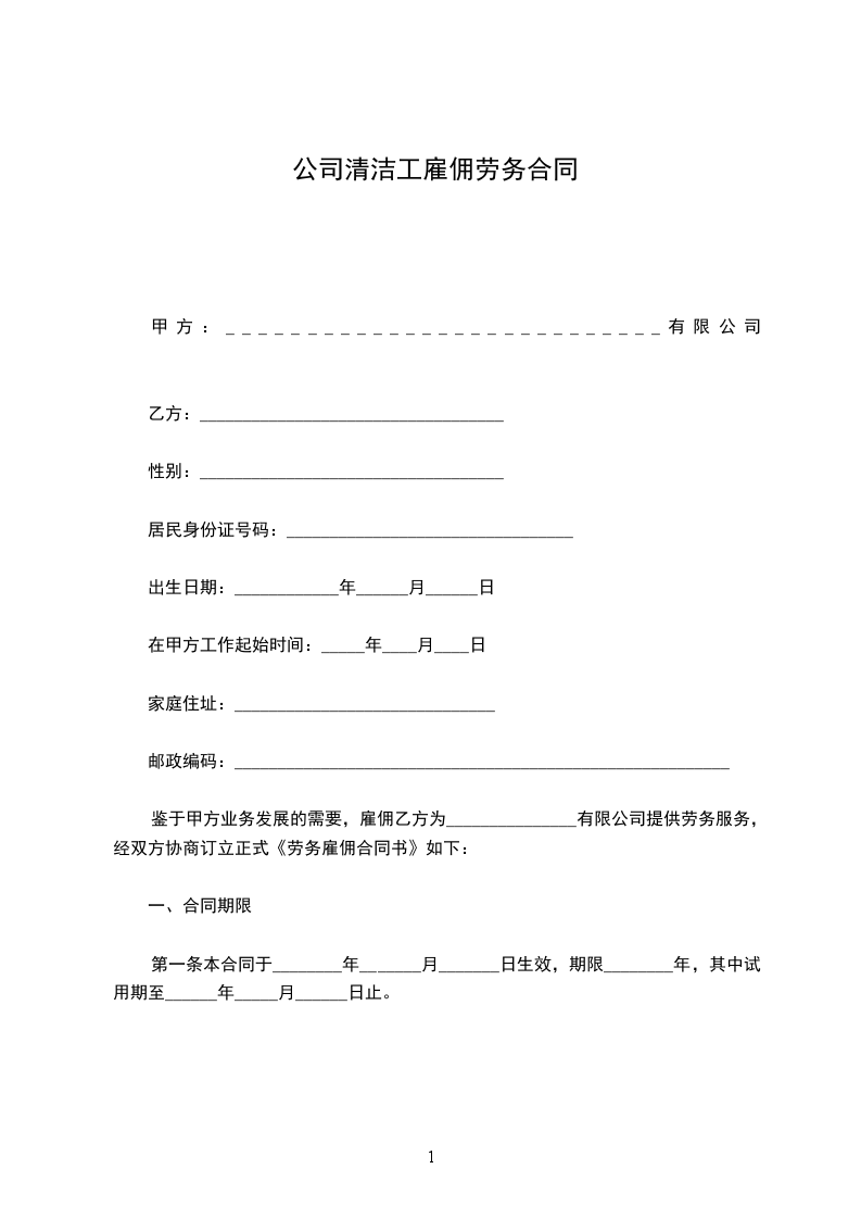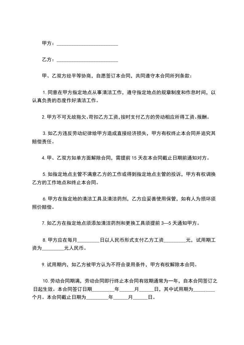 因工作需要,甲方聘用清洁工一名,乙方自愿承担此项任务,经甲乙双方在平等、自愿、协商一致的基础上,特订如下协议:
