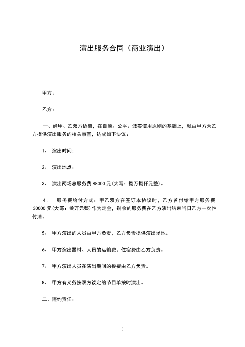 1.乙方负责为甲方策划、组织并执行[演出活动名称],具体演出时间为[演出日期],演出地点为[演出地点详细地址]。