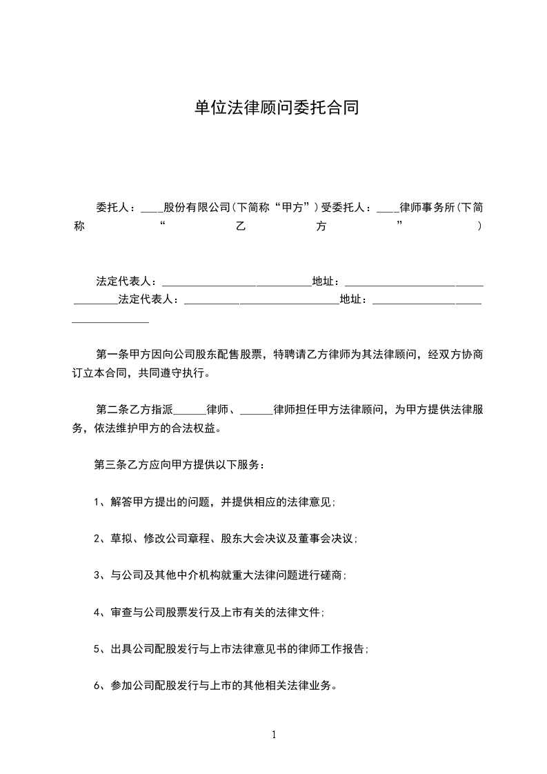 第一条甲方就增资发行内资股(以下简称增发)工作所涉法律事项,按照本合同约定的条件委托乙方办理。乙方受甲方的委托,组成工作小组,并指派具有从事证券业务资格和经验的注册律师完成甲方委托的法律事务。