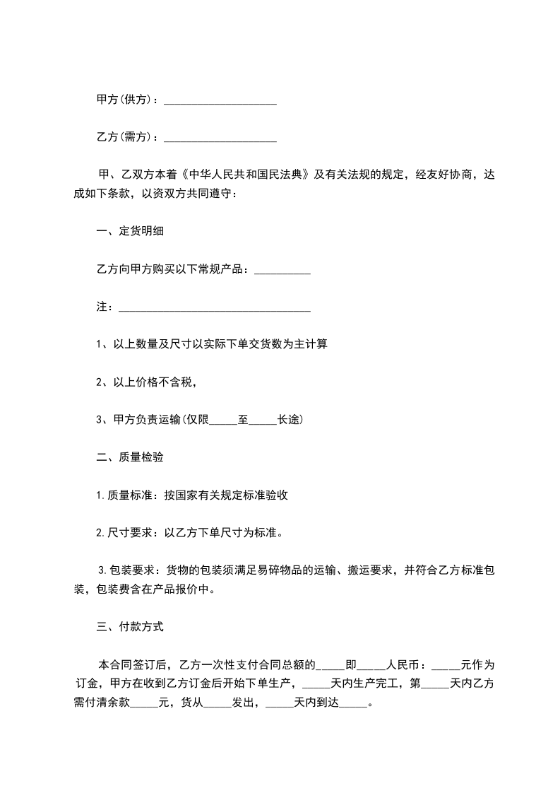 本合同签订后,乙方一次性支付合同总额的_____即_____人民币:_____元作为订金,甲方在收到乙方订金后开始下单生产,_____天内生产完工,第_____天内乙方需付清余款_____元,货从_____发出,_____天内到达_____。