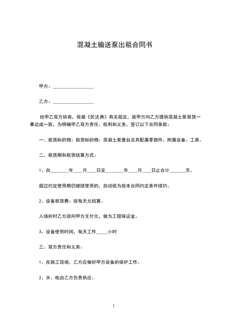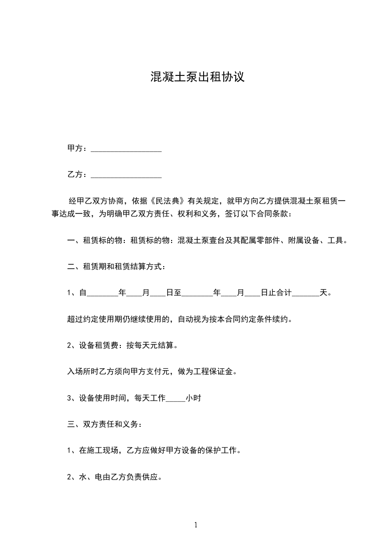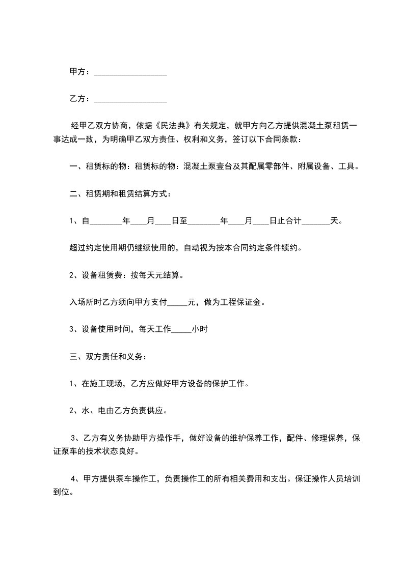 经甲乙双方协商,依据《民法典》有关规定,就甲方向乙方提供混凝土泵租赁一事达成一致,为明确甲乙双方责任、权利和义务,签订以下合同条款: