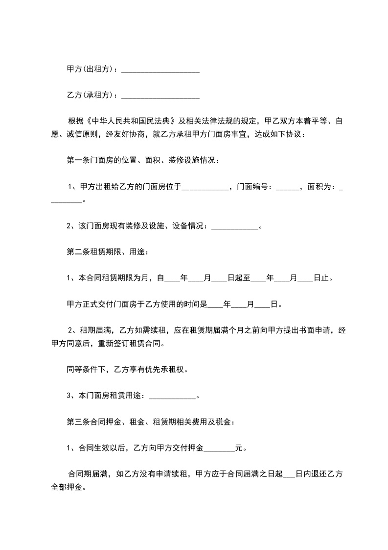 根据《中华人民共和国民法典》及相关法律法规的规定,甲乙双方本着平等、自愿、诚信原则,经友好协商,就乙方承租甲方门面房事宜,达成如下协议: