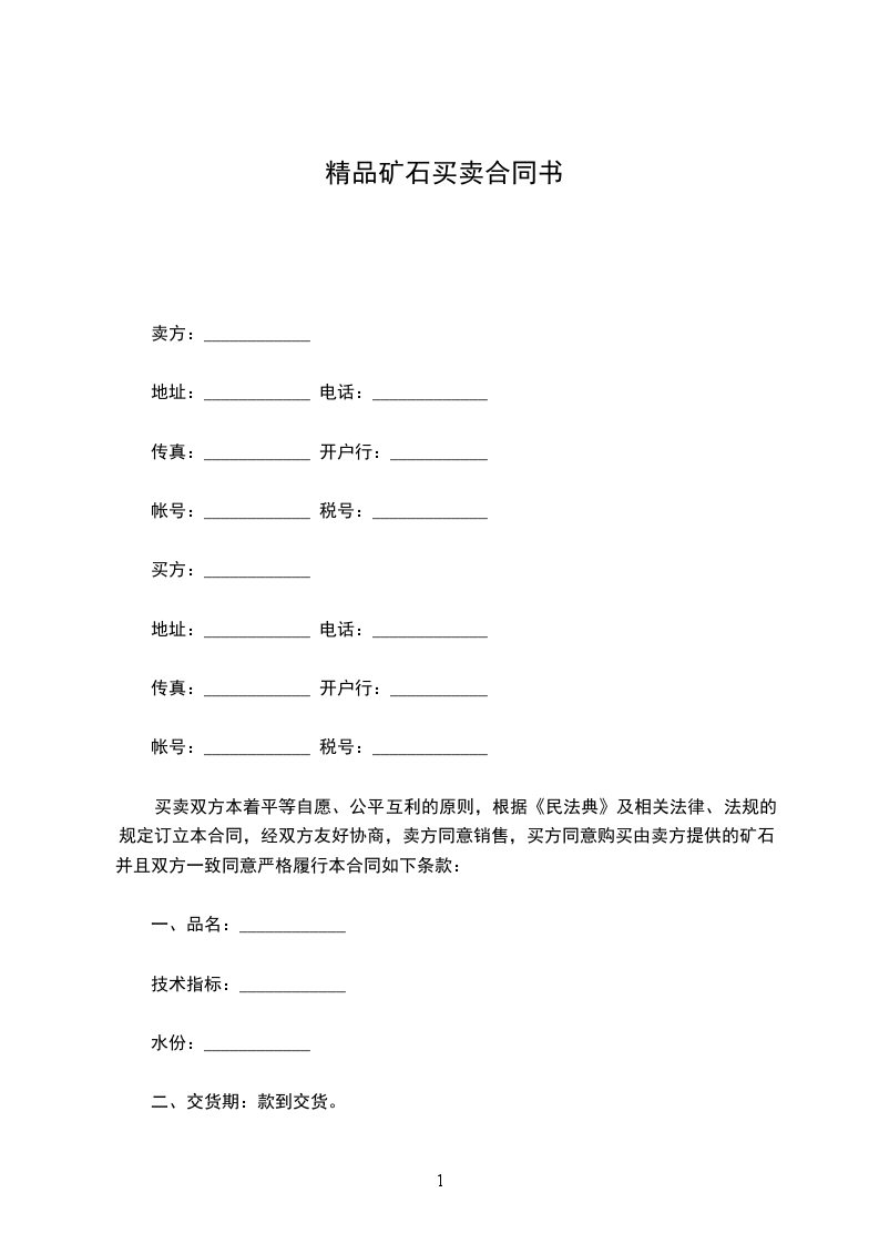 买卖双方本着平等自愿、公平互利的原则,根据《民法典》及相关法律、法规的规定订立本合同,经双方友好协商,卖方同意销售,买方同意购买由卖方提供的矿石,并且双方一致同意严格履行本合同如下条款: