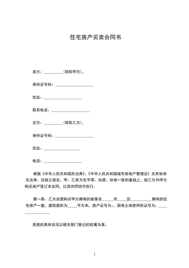 第一条:乙方自愿购买甲方拥有的座落在______市_____区___________拥有的住宅房产一套,建筑面积为_____平方米,房产证号为:,国有土地使用权证号为:_________________