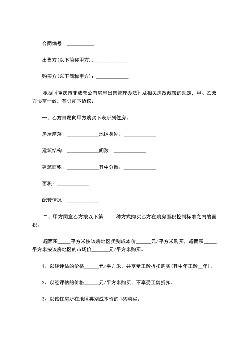 根据《重庆市非成套公有房屋出售管理办法》及相关房改政策的规定,甲、乙双方协商一致,签订如下协议:
