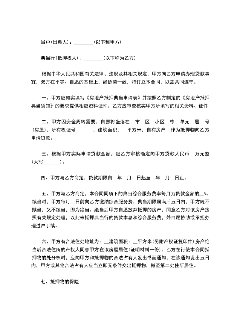 1.综合费用:乙方应按照每月____%的标准向甲方支付综合费用,综合费用按月计算,在典当期限内,乙方应于每月____日前向甲方支付当月综合费用。