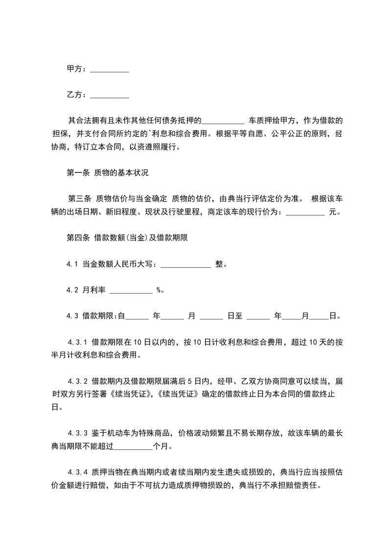 篇4典当铺抵押车合同