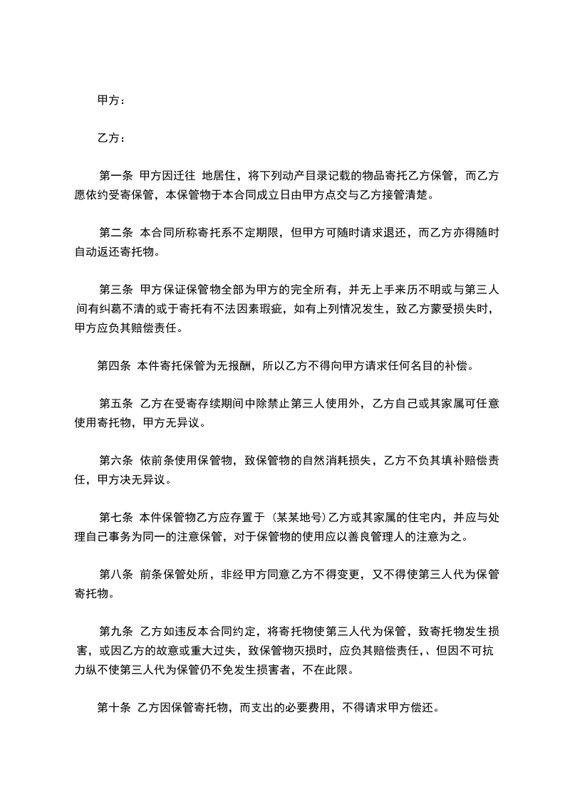 兹为保管,经双方同意,达成如下协议:第一条甲方因迁往地居住,将下列动产目录记载的物品寄托乙方保管,而乙方愿依约受寄保管,本保管物于本合同成立日由甲方点交与乙方接管清楚。