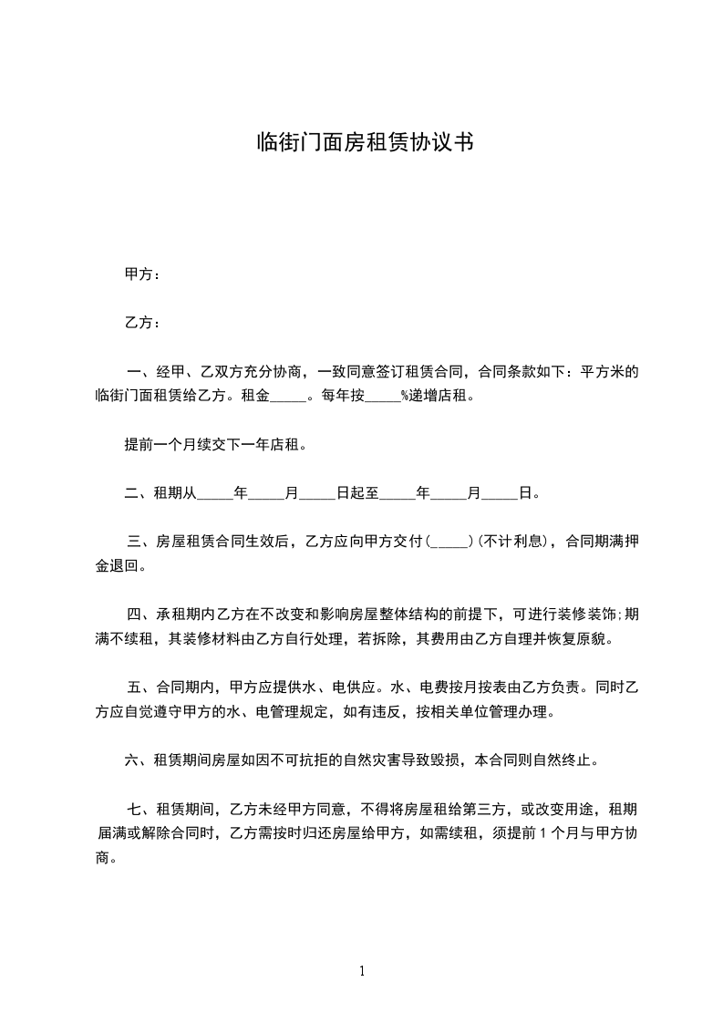 一、经甲、乙双方充分协商,一致同意签订租赁合同,合同条款如下:平方米的临街门面租赁给乙方。租金_____。每年按_____%递增店租。
