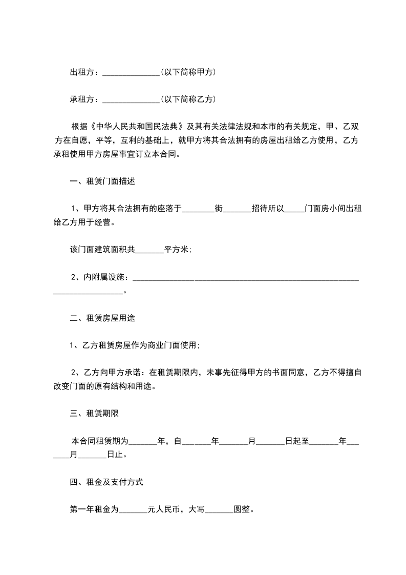 1、甲方将其合法拥有的座落于________街_______招待所以_____门面房小间出租给乙方用于经营。