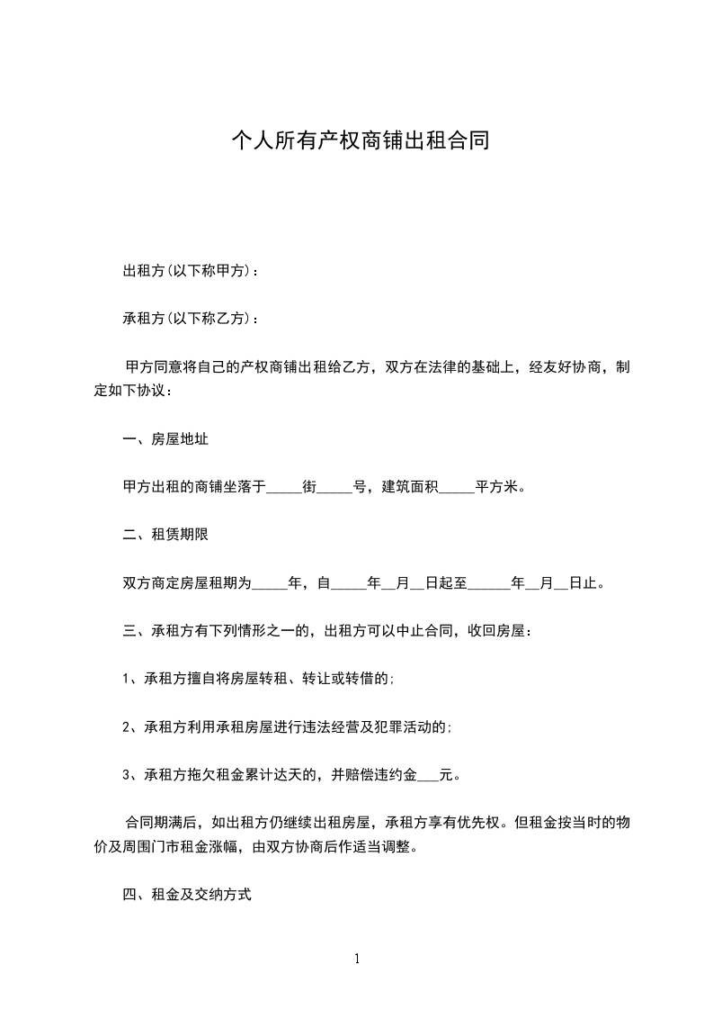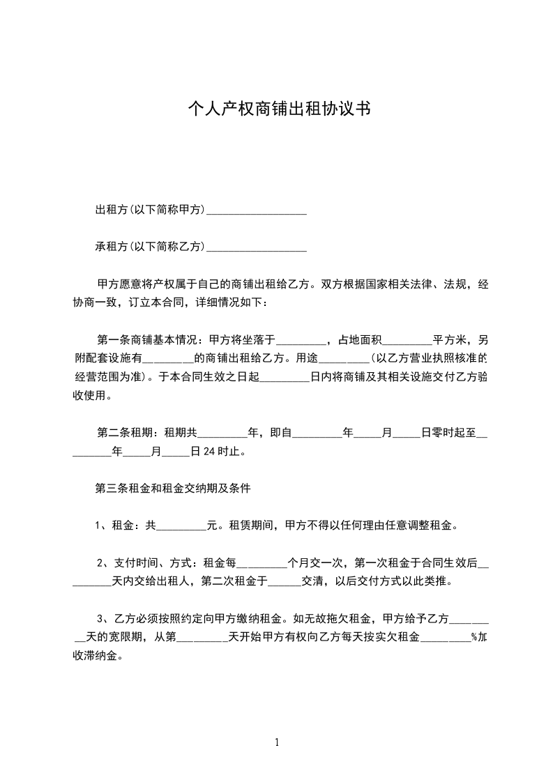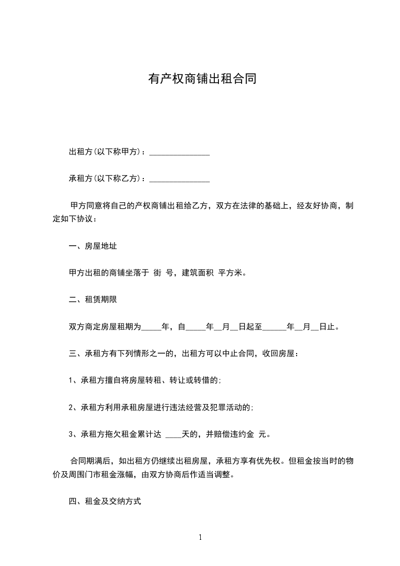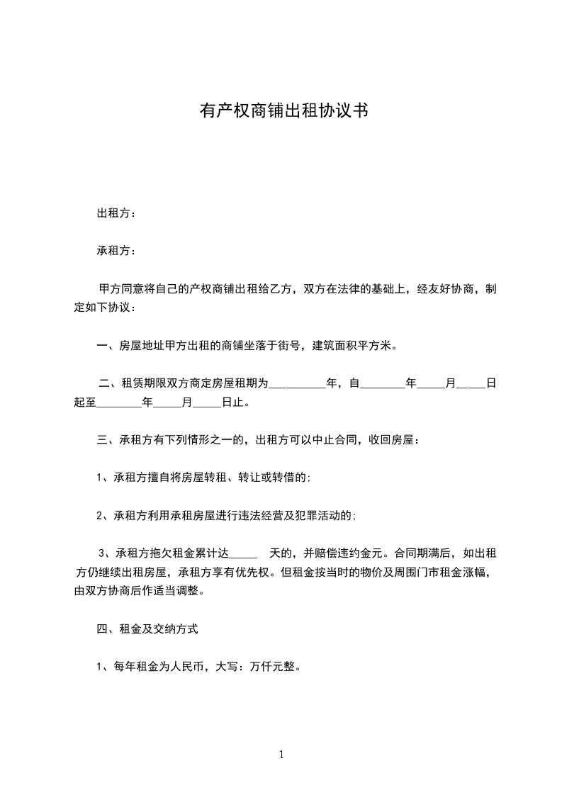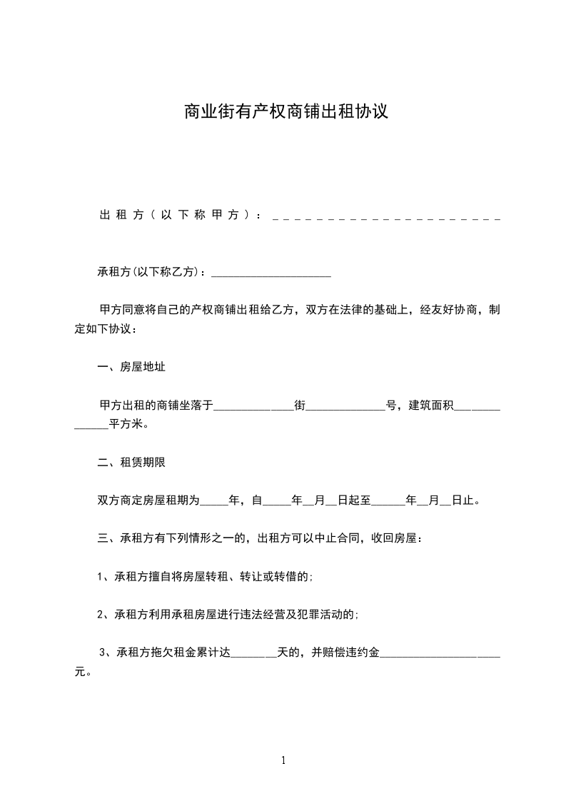 甲方同意将自己的产权商铺出租给乙方,双方在法律的基础上,经友好协商,制定如下协议: