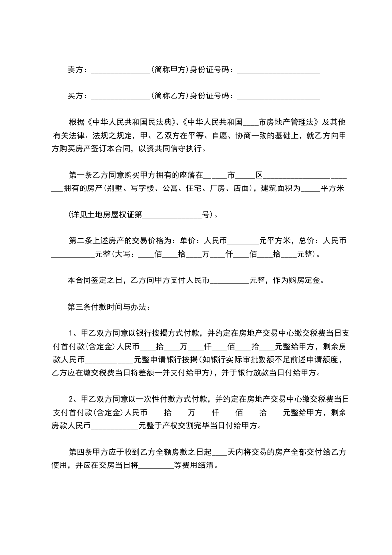 第二条上述房产的交易价格为:单价:人民币________元平方米,总价:人民币___________元整(大写:____佰____拾____万____仟____佰____拾____元整)。