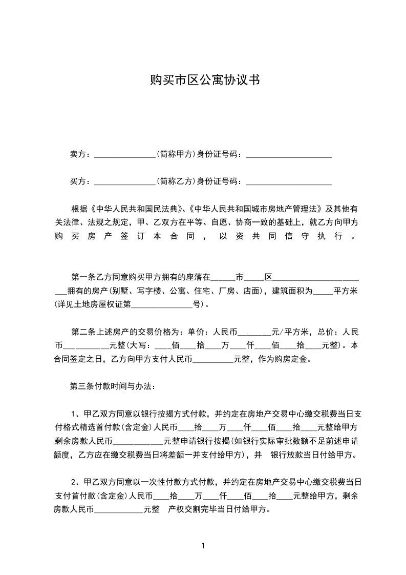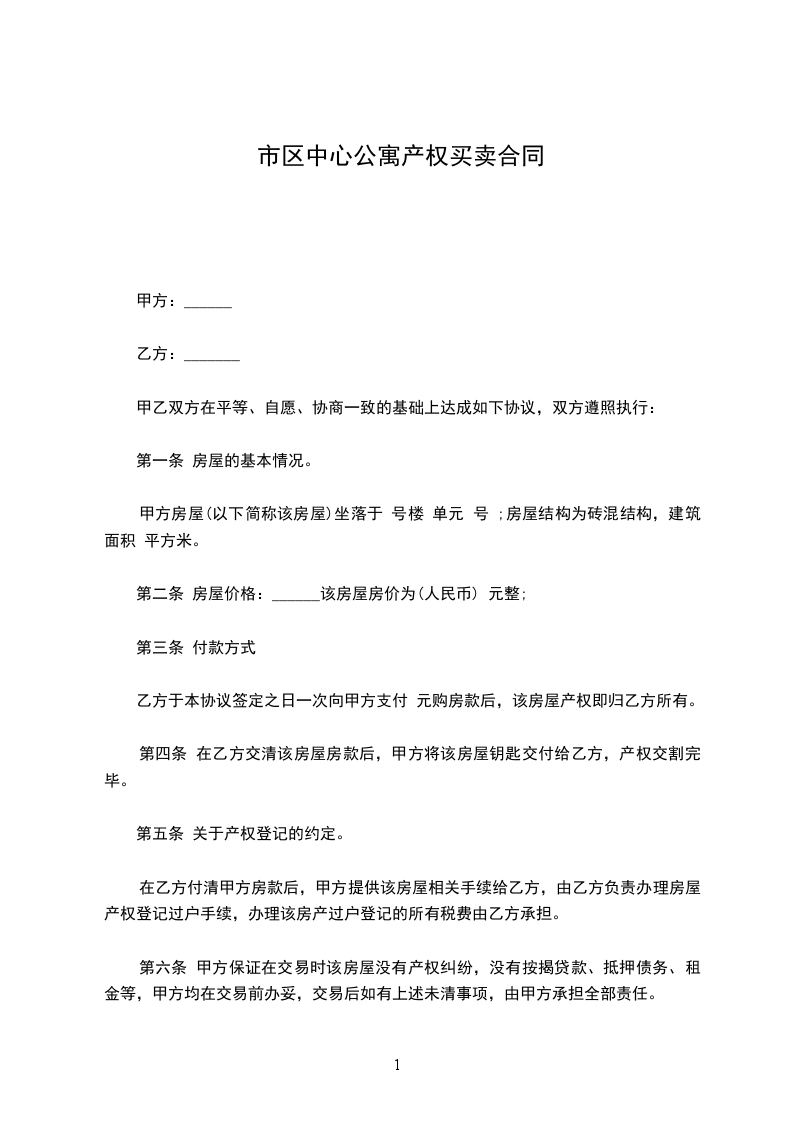 第一条乙方同意购买甲方拥有的座落在______市_____区________________________拥有的房产(别墅、写字楼、公寓、住宅、厂房、店面),建筑面积为_____平方米。