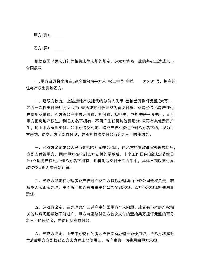 买方:_______________(简称乙方)身份证号码:_____________________