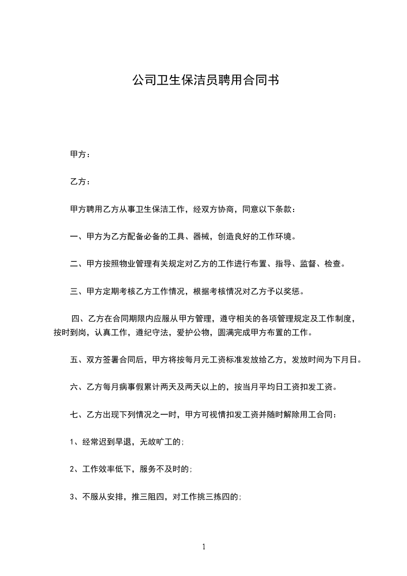 甲方聘用乙方从事卫生保洁工作,经双方协商,同意以下条款: