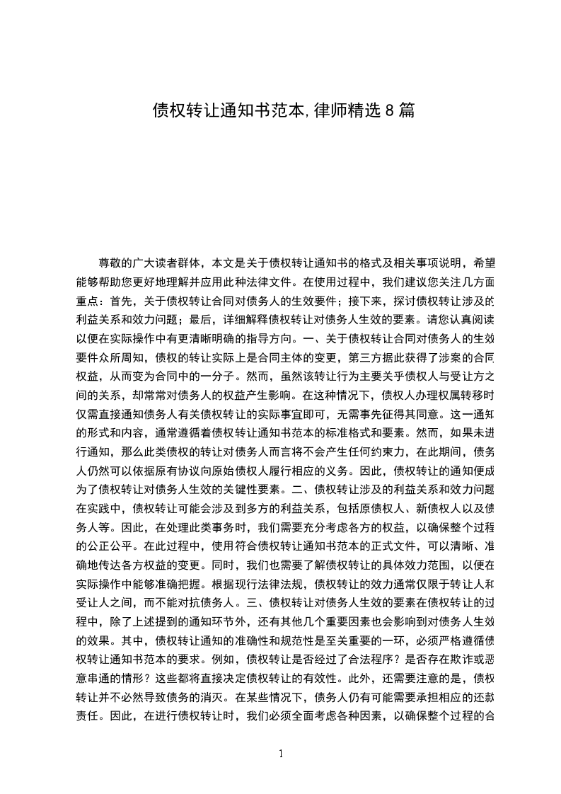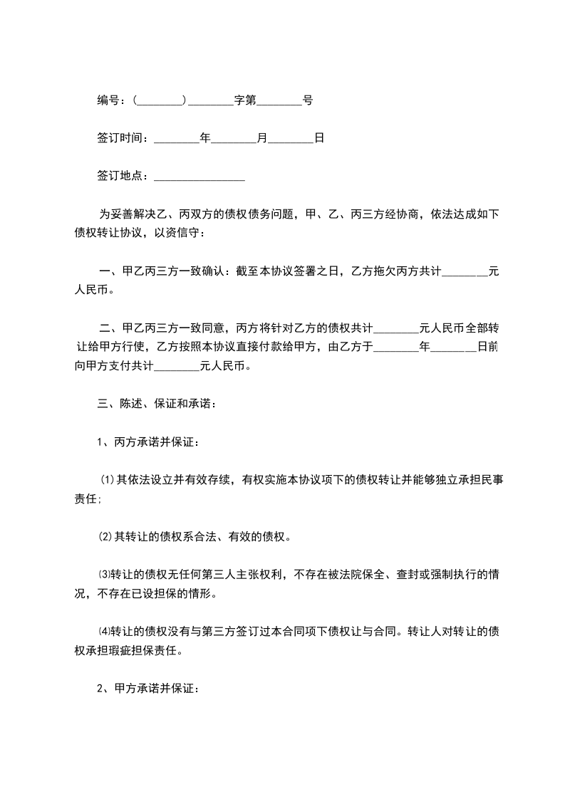 鉴于甲方对[债务人姓名/名称](以下简称“债务人”)享有合法有效的债权,现甲方拟将该债权转让给乙方,经双方友好协商,就债权转让事宜达成如下协议:
