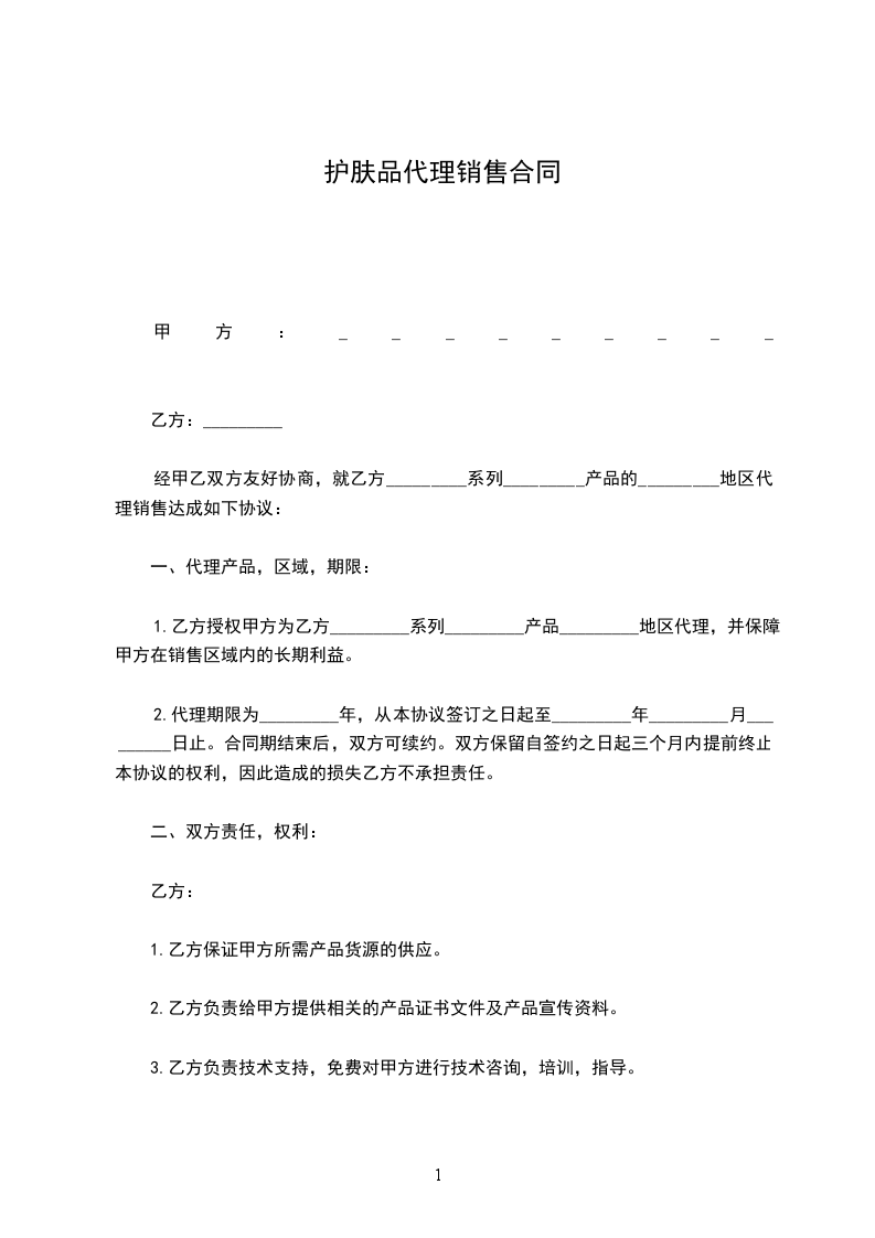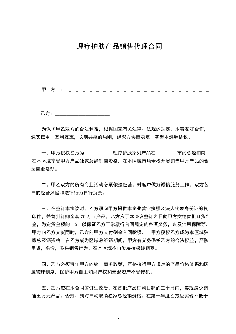 1.乙方授权甲方为乙方_________系列_________产品_________地区代理,并保障甲方在销售区域内的长期利益。