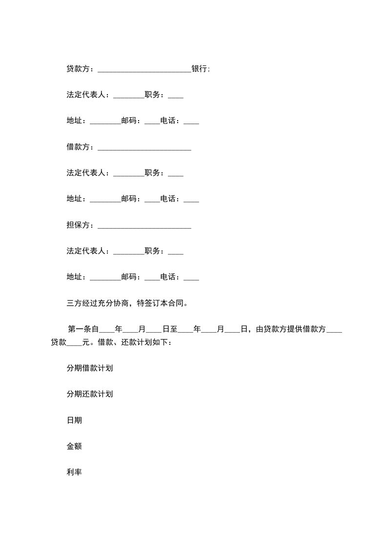 第一条自____年____月____日至____年____月____日,由贷款方提供借款方____贷款____元。借款、还款计划如下: