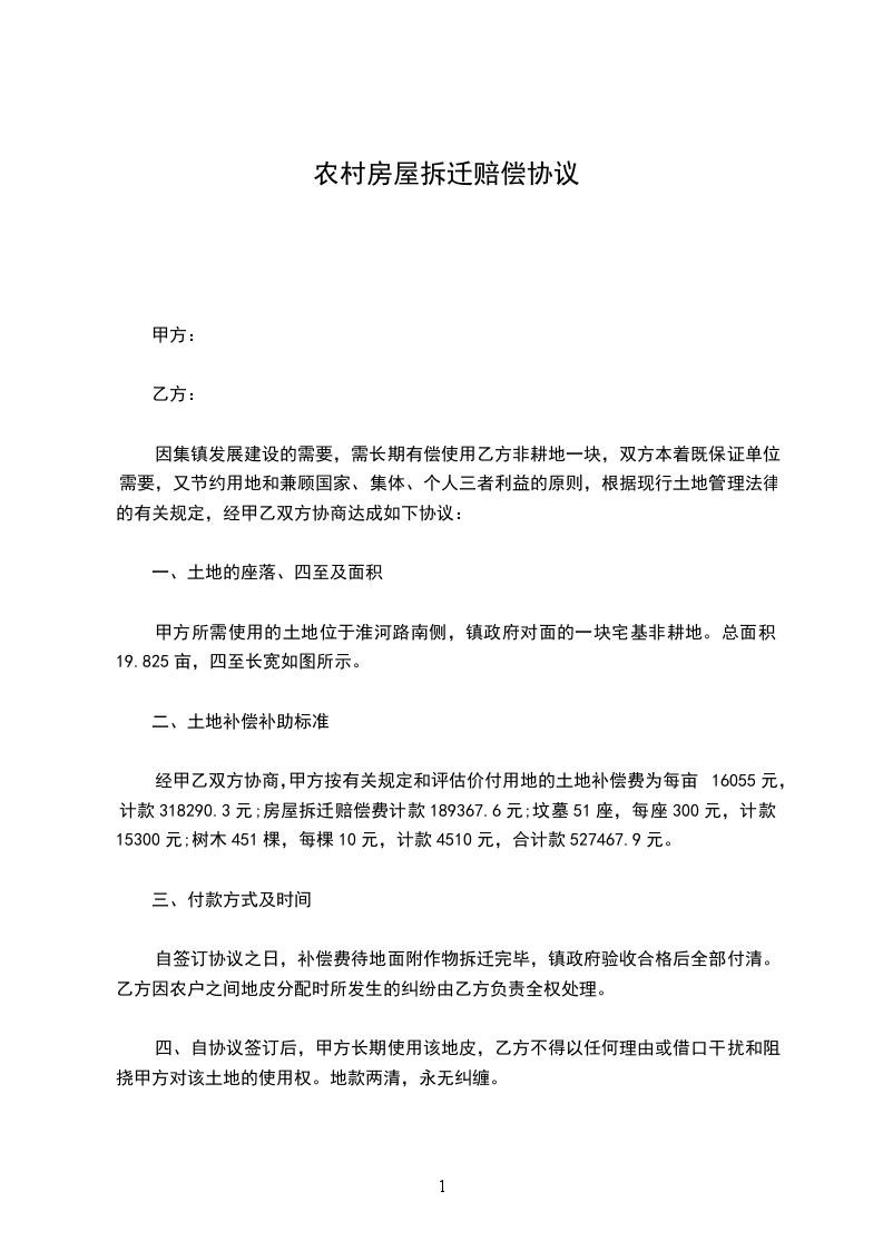 经甲乙双方协商,甲方按有关规定和评估价付用地的土地补偿费为每亩16055元,计款318290.3元;房屋拆迁赔偿费计款189367.6元;坟墓51座,每座300元,计款15300元;树木451棵,每棵10元,计款4510元,合计款527467.9元。