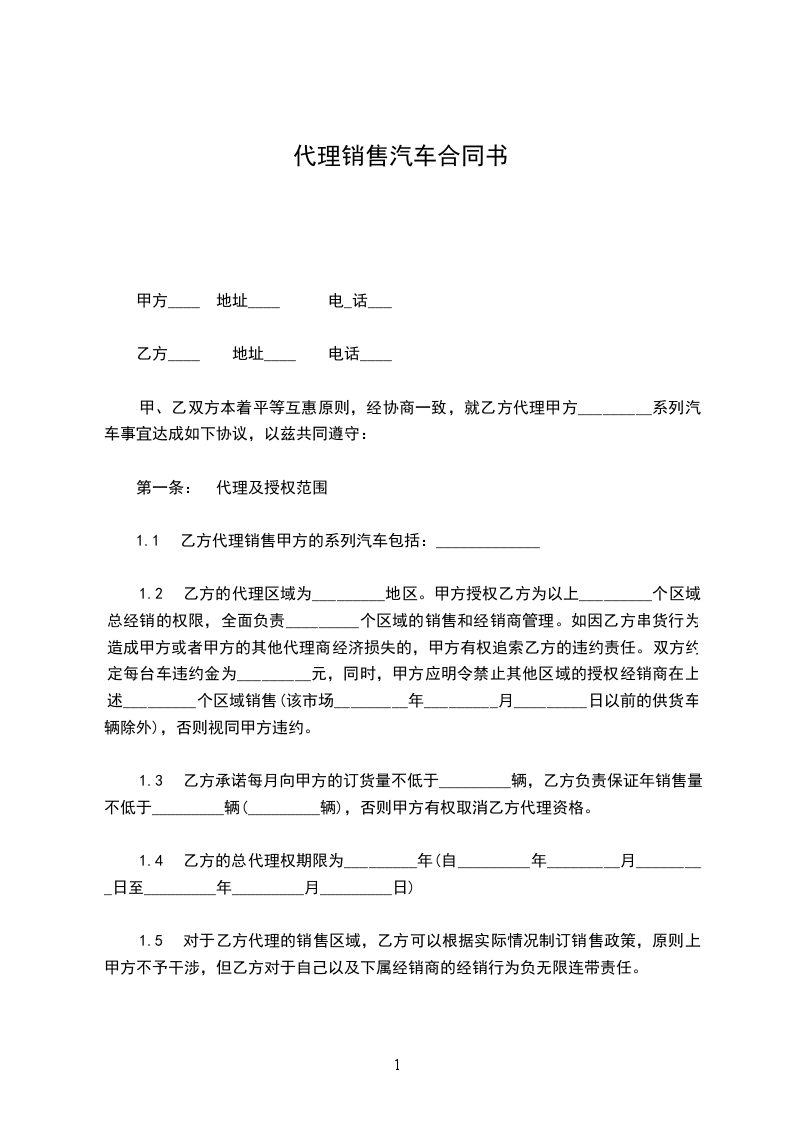 1.3 乙方承诺每月向甲方的订货量不低于_________辆,乙方负责保证年销售量不低于_________辆(_________辆),否则甲方有权取消乙方代理资格。