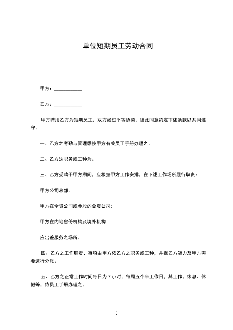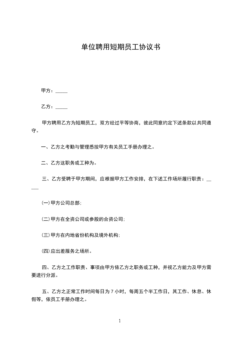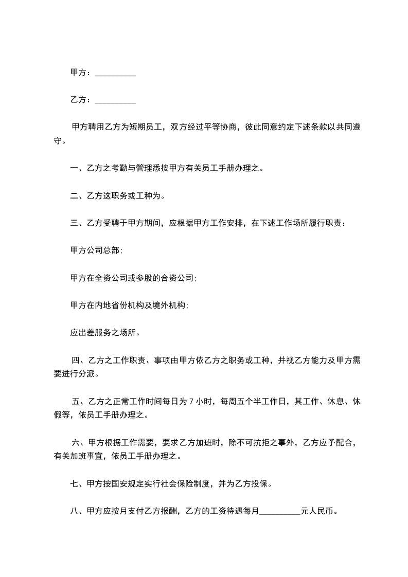 甲方聘用乙方为短期员工,双方经过平等协商,彼此同意约定下述条款以共同遵守。