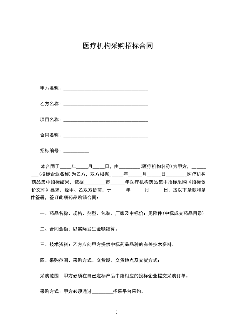 本合同于_____年_____月_____日,由_________(医疗机构名称)为甲方,_________(投标企业名称)为乙方,双方根据______年______月______日_________医疗机构药品集中招标结果,依据_________市______年医疗机构药品集中招标采购《招标议价文件》要求,经甲、乙双方协商,于______年______月______日,按以下条款和条件签署,签订此项药品购销合同: