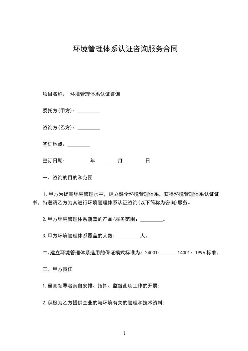 1.履行期限:_________年_________月_________日至甲方通过环境管理体系认证时结束。
