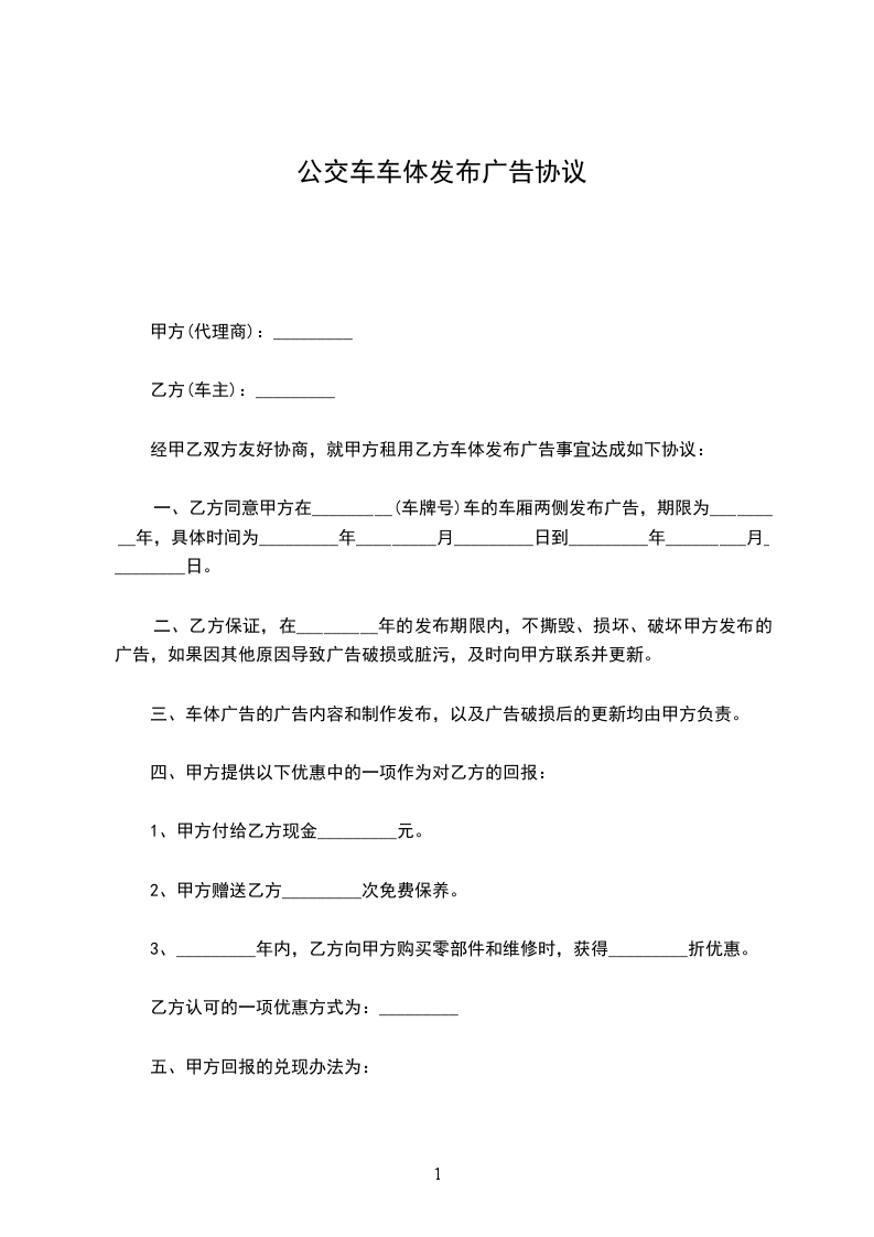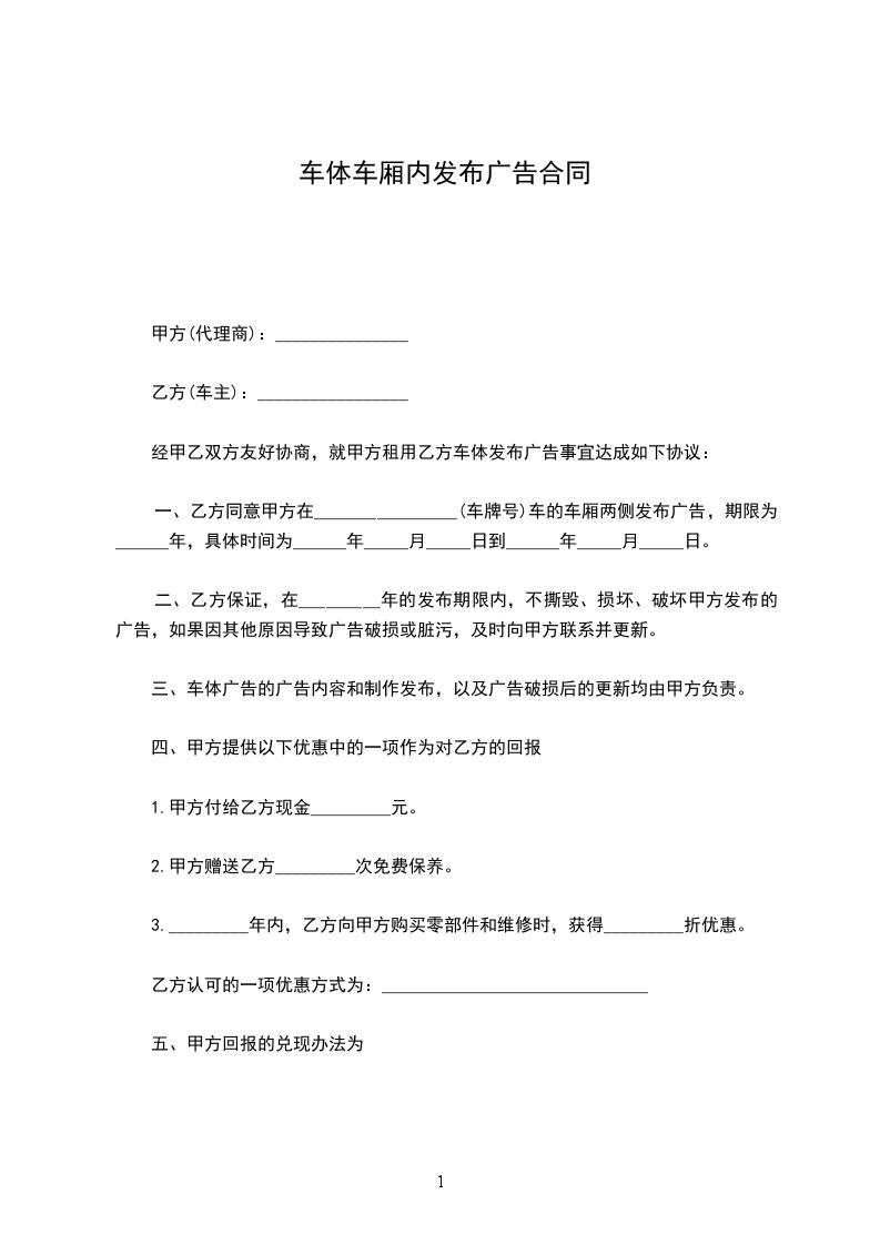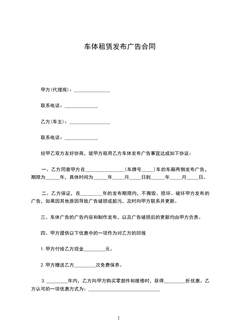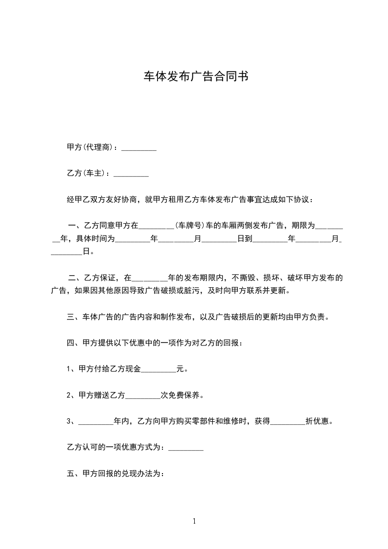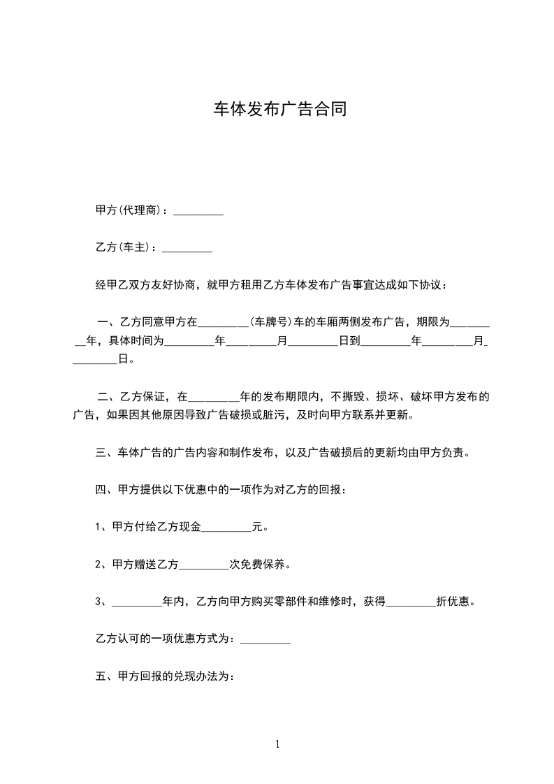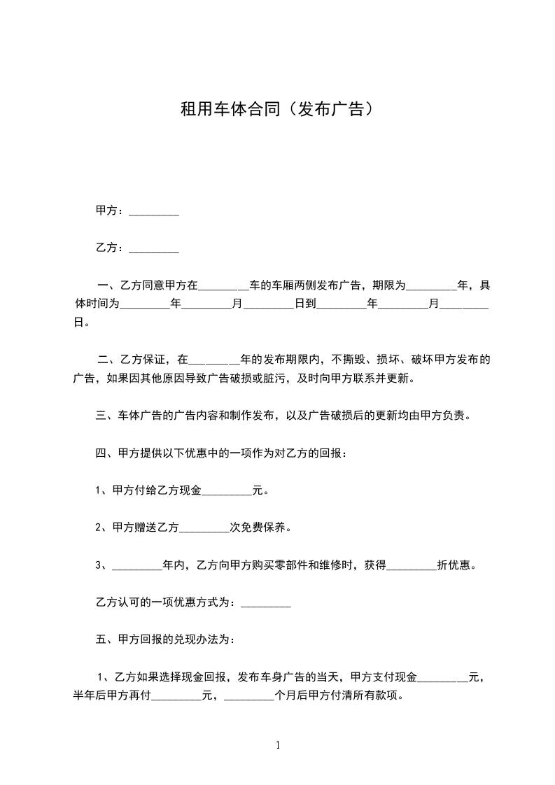 一、乙方同意甲方在_________(车牌号)车的车厢两侧发布广告,期限为_________年,具体时间为_________年_________月_________日到_________年_________月_________日。