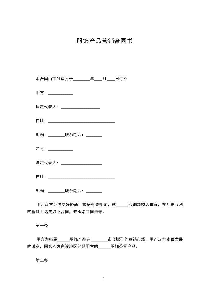 甲方为拓展______服饰产品在________市(地区)的营销市场,甲乙双方本着发展的诚意,同意乙方在该地区经销甲方的______服饰公司产品。
