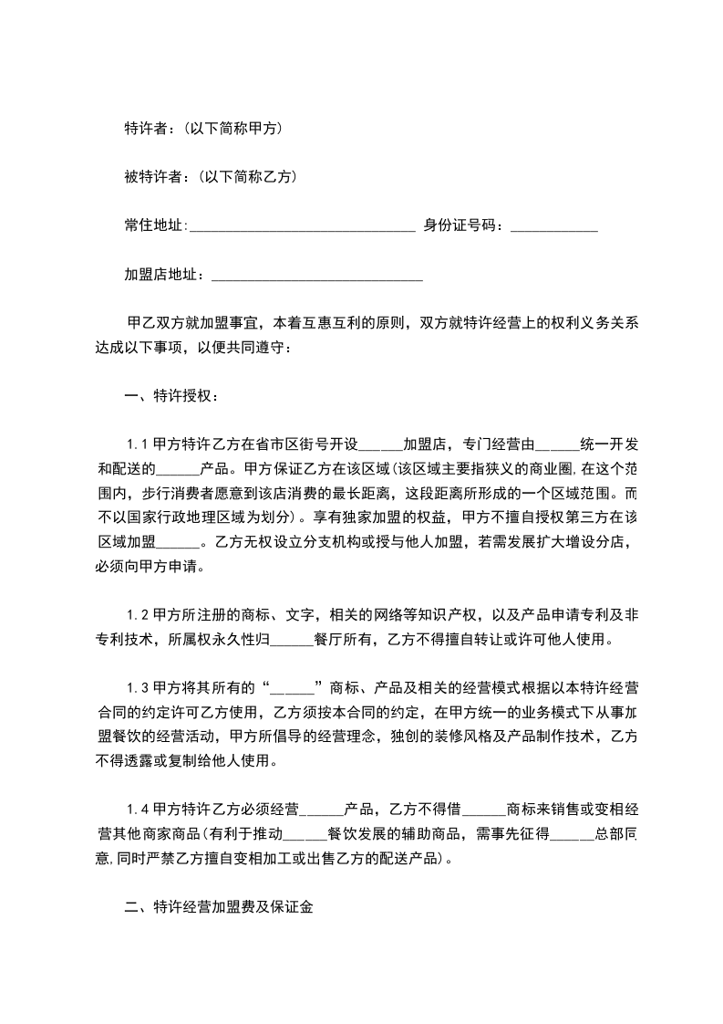 1.1甲方特许乙方在省市区街号开设______加盟店,专门经营由______统一开发和配送的______产品。甲方保证乙方在该区域(该区域主要指狭义的商业圈,在这个范围内,步行消费者愿意到该店消费的最长距离,这段距离所形成的一个区域范围。而不以国家行政地理区域为划分)。享有独家加盟的权益,甲方不擅自授权第三方在该区域加盟______。乙方无权设立分支机构或授与他人加盟,若需发展扩大增设分店,必须向甲方申请。