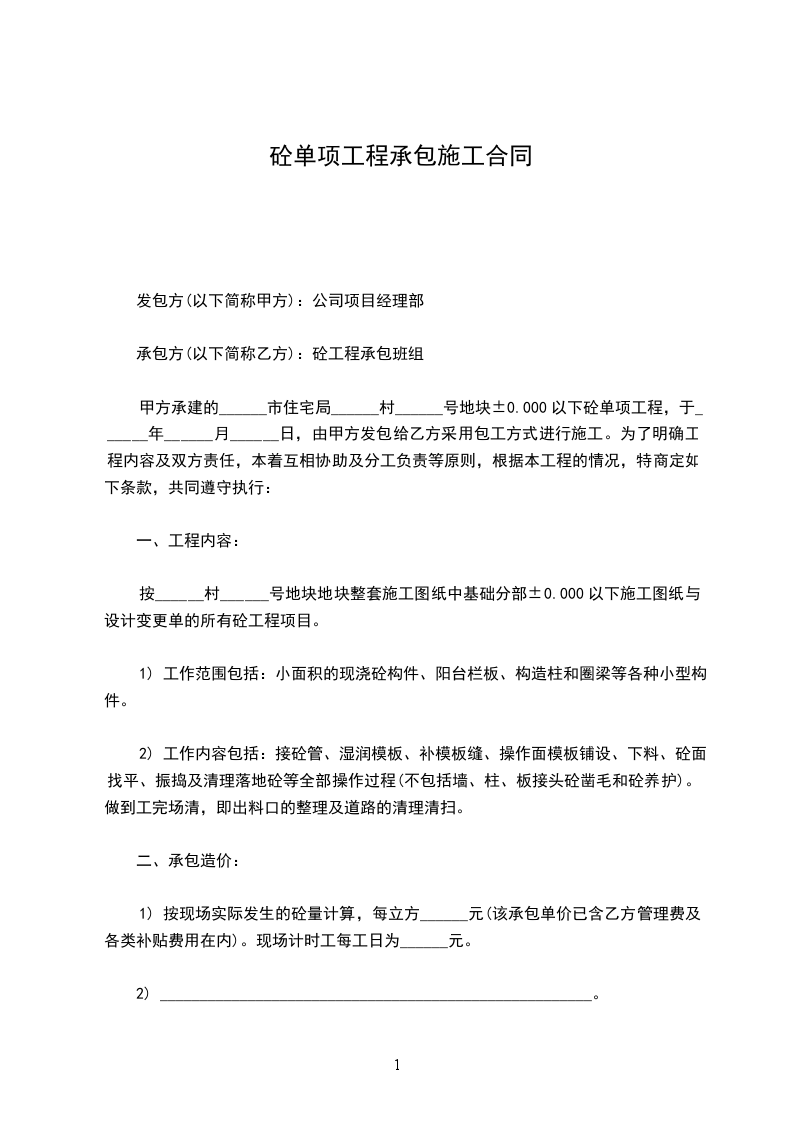甲方承建的______市住宅局______村______号地块±0.000以下砼单项工程,于______年______月______日,由甲方发包给乙方采用包工方式进行施工。为了明确工程内容及双方责任,本着互相协助及分工负责等原则,根据本工程的情况,特商定如下条款,共同遵守执行: