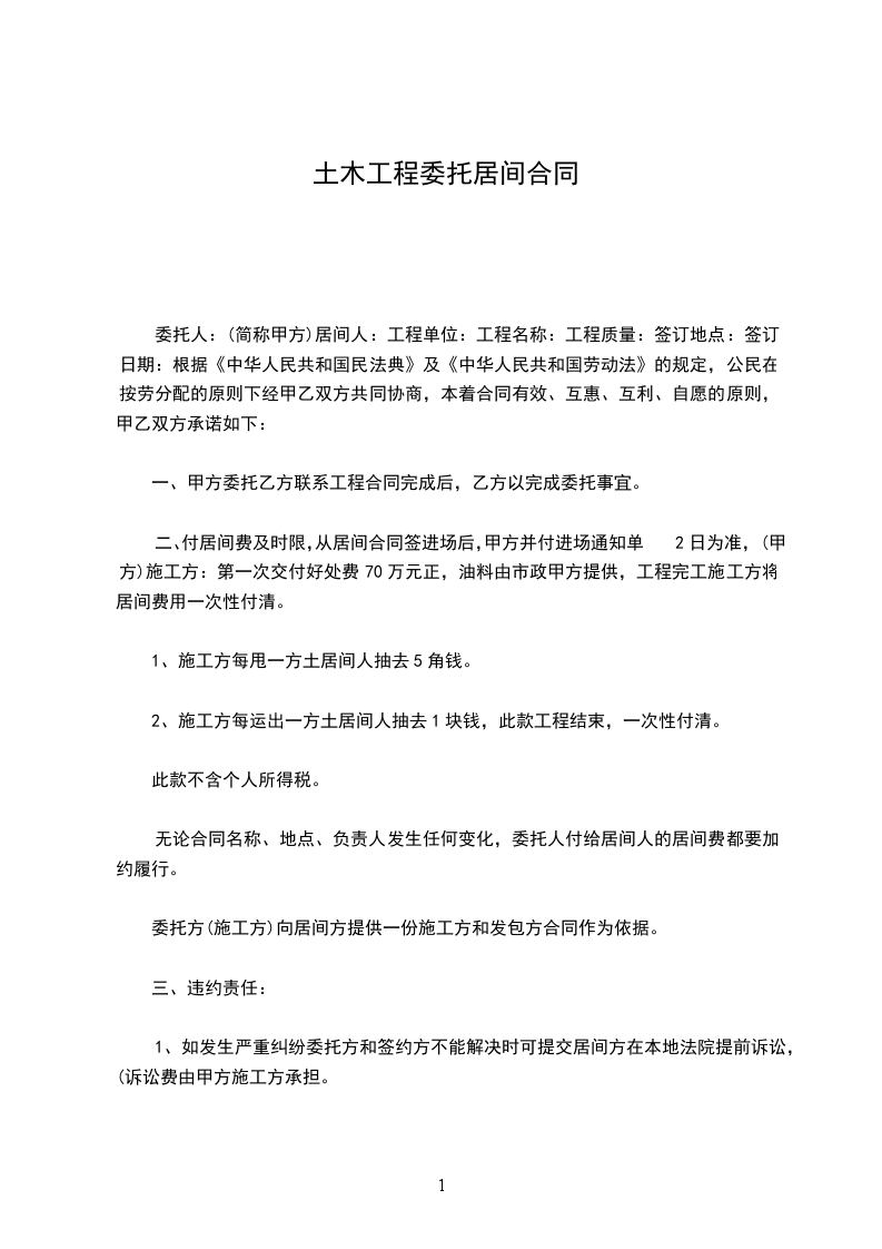 委托人:(简称甲方)居间人:工程单位:工程名称:工程质量:签订地点:签订日期:根据《中华人民共和国民法典》及《中华人民共和国劳动法》的规定,公民在按劳分配的原则下经甲乙双方共同协商,本着合同有效、互惠、互利、自愿的原则,甲乙双方承诺如下: