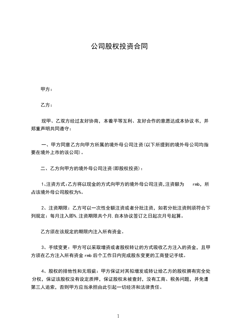 一、甲方同意乙方向甲方所属的境外母公司注资(以下所提到的境外母公司均指要在境外上市的该公司)。