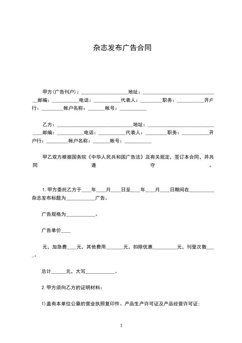 甲方(广告刊户):___________________地址:_______________________________邮编:___________电话:___________代表人:_________职务:___________开户行:_________账户名称:_______帐号:___________