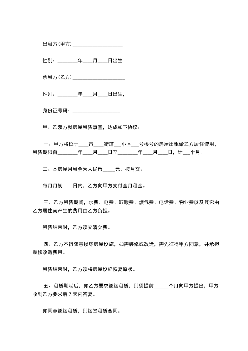 一、甲方将位于____市____街道___小区___号楼号的房屋出租给乙方居住使用,租赁期限自________年____月____日至________年____月____日,计___个月。