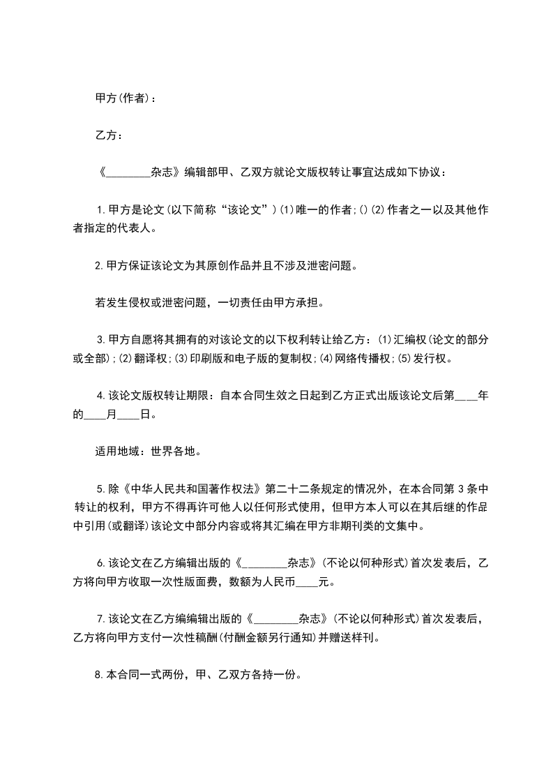 7.该论文在乙方编编辑出版的《________杂志》(不论以何种形式)首次发表后,乙方将向甲方支付一次性稿酬(付酬金额另行通知)并赠送样刊。