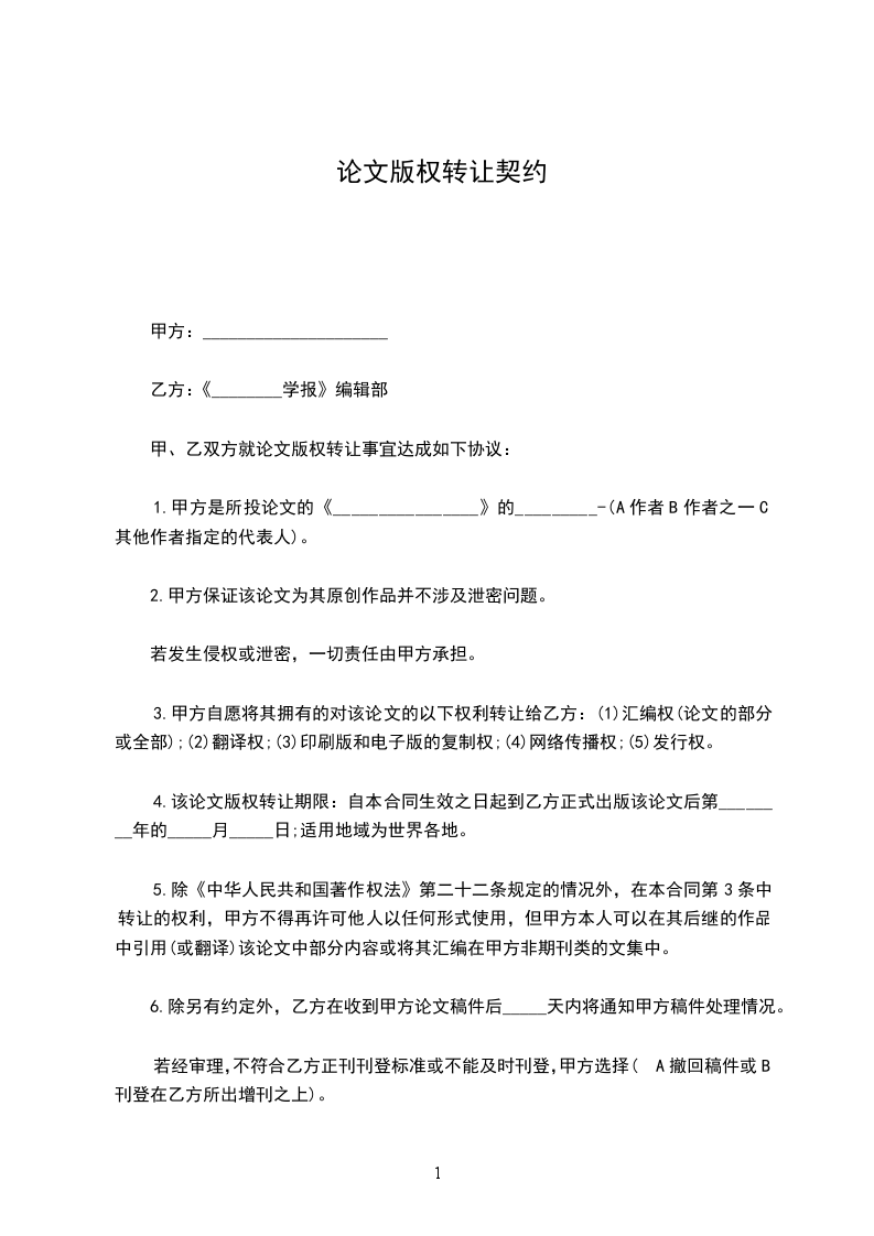 5.除《中华人民共和国著作权法》第二十二条规定的情况外,在本合同第3条中转让的权利,甲方不得再许可他人以任何形式使用,但甲方本人可以在其后继的作品中引用(或翻译)该论文中部分内容或将其汇编在甲方非期刊类的文集中。