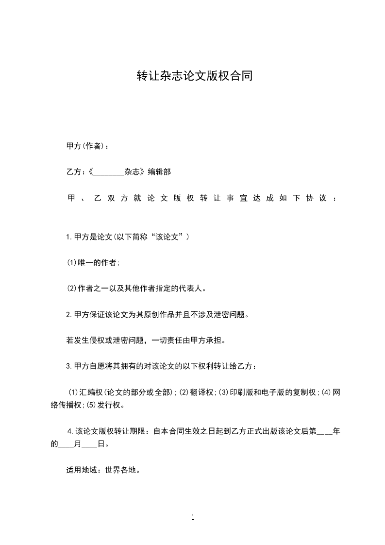 4.该论文版权转让期限:自本合同生效之日起到乙方正式出版该论文后第____年的____月____日。