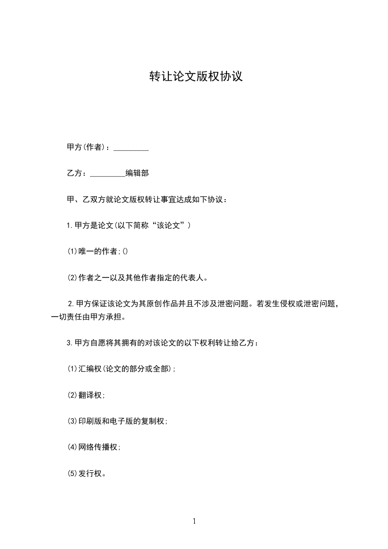 甲、乙双方就论文版权转让事宜达成如下协议: