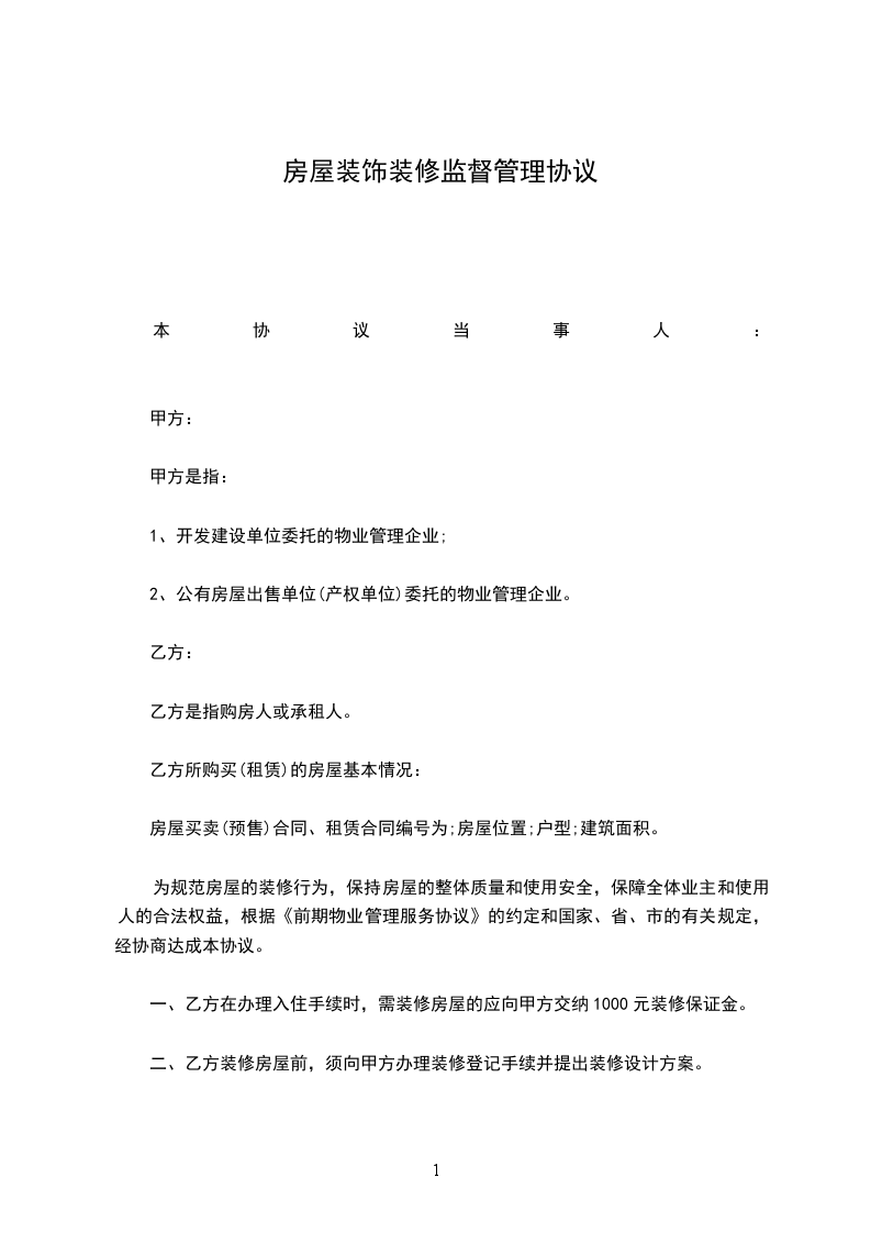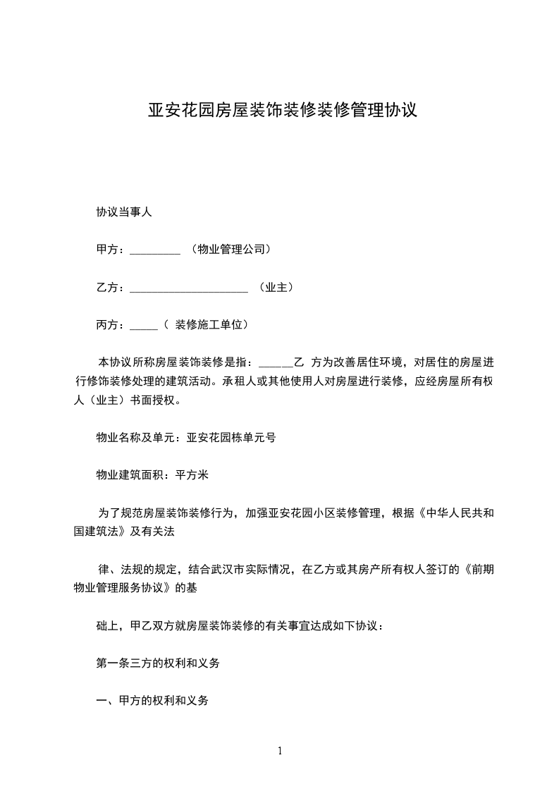 为规范房屋的装修行为,保持房屋的整体质量和使用安全,保障全体业主和使用人的合法权益,根据《前期物业管理服务协议》的约定和国家、省、市的有关规定,经协商达成本协议。