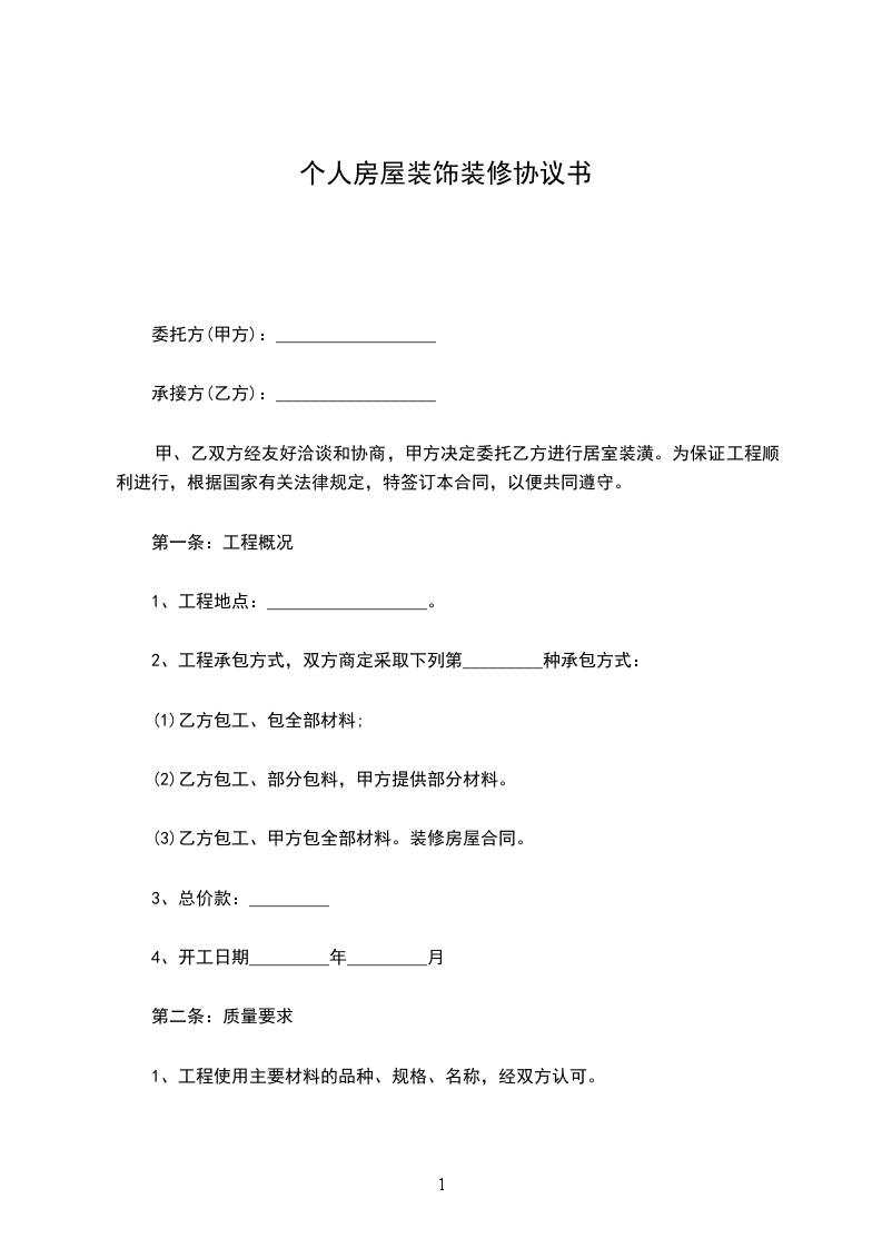 一、乙方在办理入住手续时,需装修房屋的应向甲方交纳_____元装修保证金。