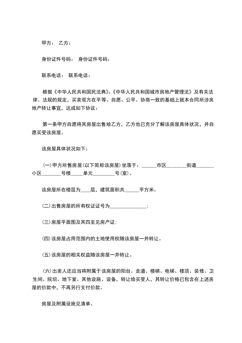 第一条甲方自愿将其房屋出售给乙方,乙方也已充分了解该房屋具体状况,并自愿买受该房屋。