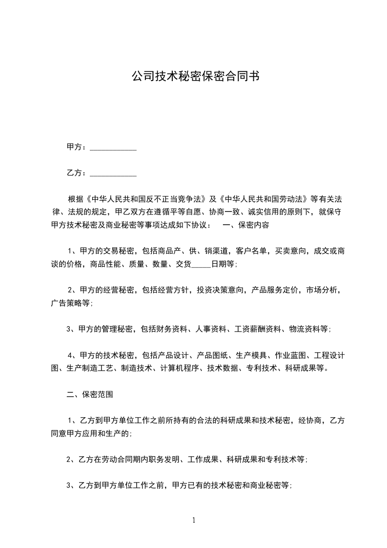 甲、乙双方根据《中华人民共和国反不正当竞争法》和国家、地方有关法律、法规及政策规定,鉴于乙方受聘甲方或服务于甲方,在职或服务期间有从甲方获得商业秘密和技术秘密的机会,有获得及增进知识、经验、技能的机会;甲方给乙方的劳动支付了工资、奖金、提成、奖励等报酬;乙方明白泄露甲方商业秘密、技术秘密会对甲方造成极大损害。