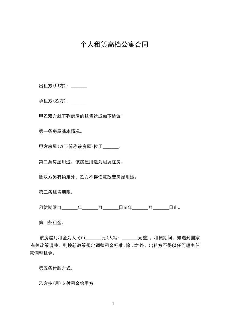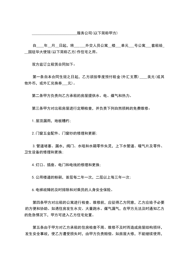 自____年__月__日起,将______外交人员公寓__楼___单元___号公寓___套租给___国驻华大使馆(以下简称乙方)作住宅之用。