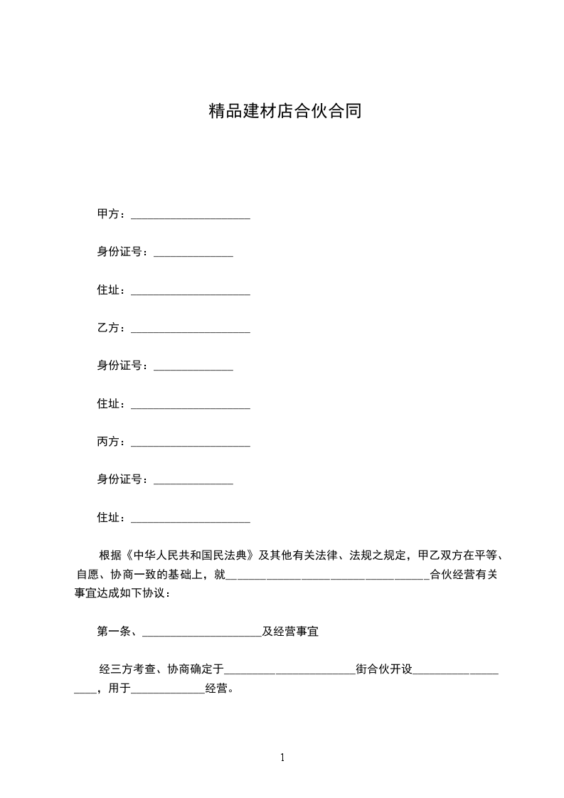 鉴于合伙人一与合伙人二有意共同经营建材店面,经友好协商,双方本着平等、自愿、公平、诚实信用的原则,依据《中华人民共和国民法典》等相关法律法规,达成如下合伙协议: