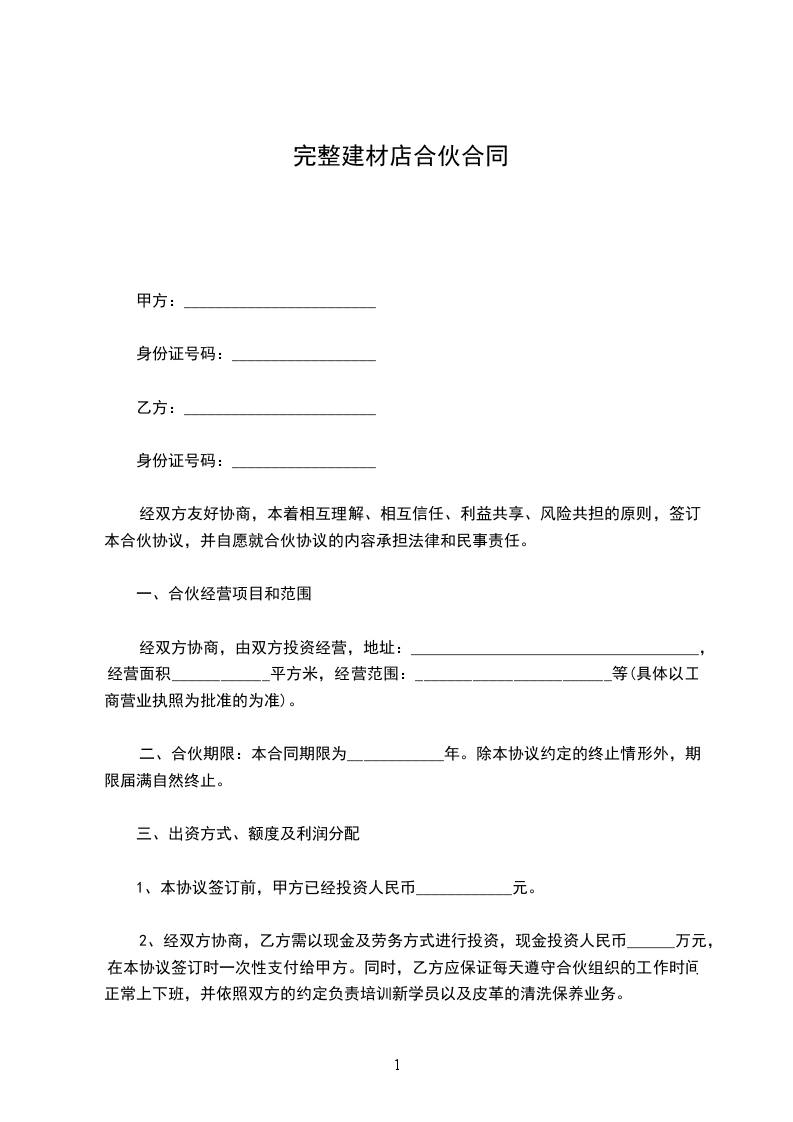 鉴于合伙人一与合伙人二有意共同经营建材店面,经友好协商,达成如下合伙协议: