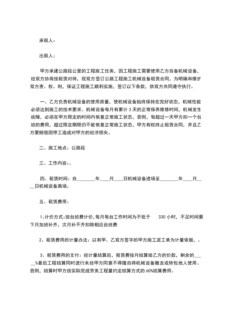 5、设备在租赁期间每月应有叁天的保养时间,(高原、工区每月应有5天的维修保养时间),每月超出的时间乙方可扣除相应天数的租赁费。