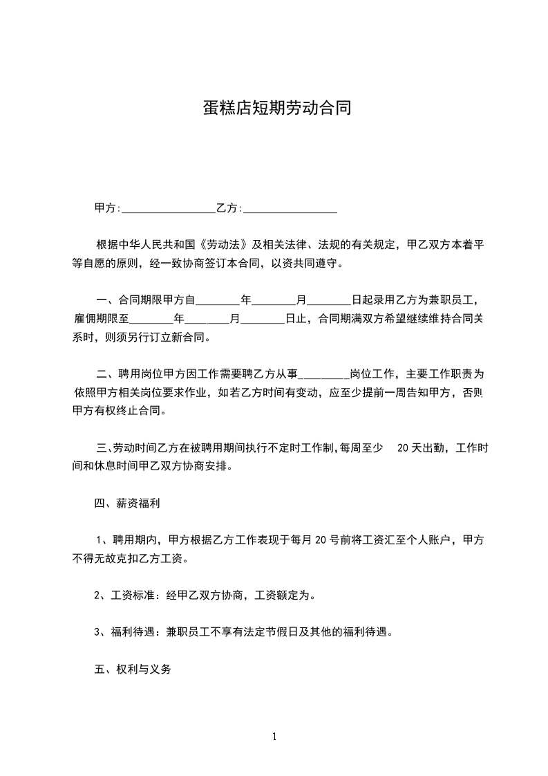 一、合同期限甲方自________年________月________日起录用乙方为兼职员工,雇佣期限至________年________月________日止,合同期满双方希望继续维持合同关系时,则须另行订立新合同。