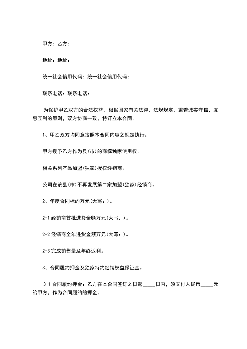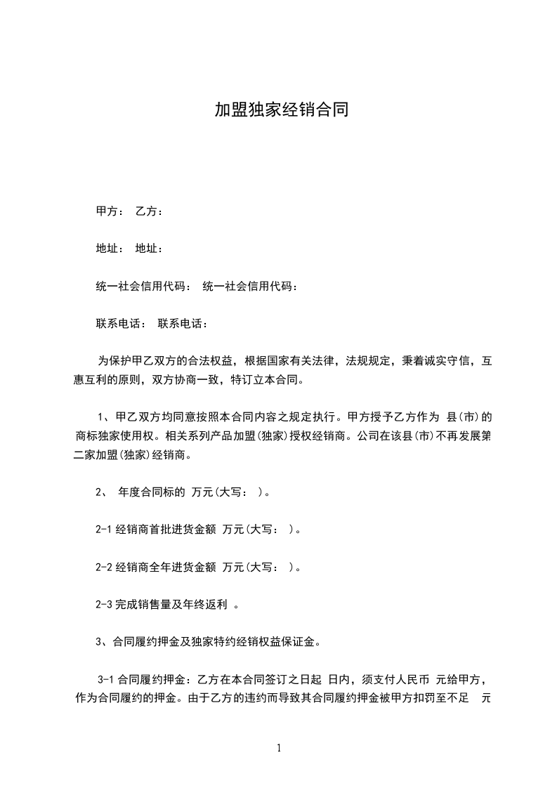 篇1加盟独家经销合同