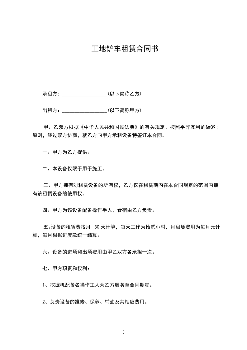 1、未经甲方同意,乙方不得以任何方式将甲方设备作为抵押转租或转运其他工地使用,由此造成的损失由乙方全部承担。